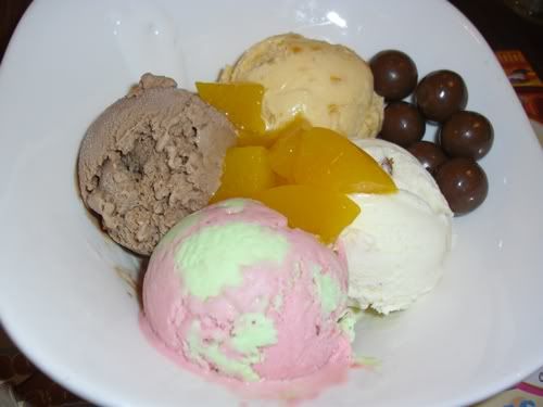 Round 1- Milo, Kiwi Raspberry, Yummy Raisin & Mango with peach cubes, malt balls and marshmallow sauce.